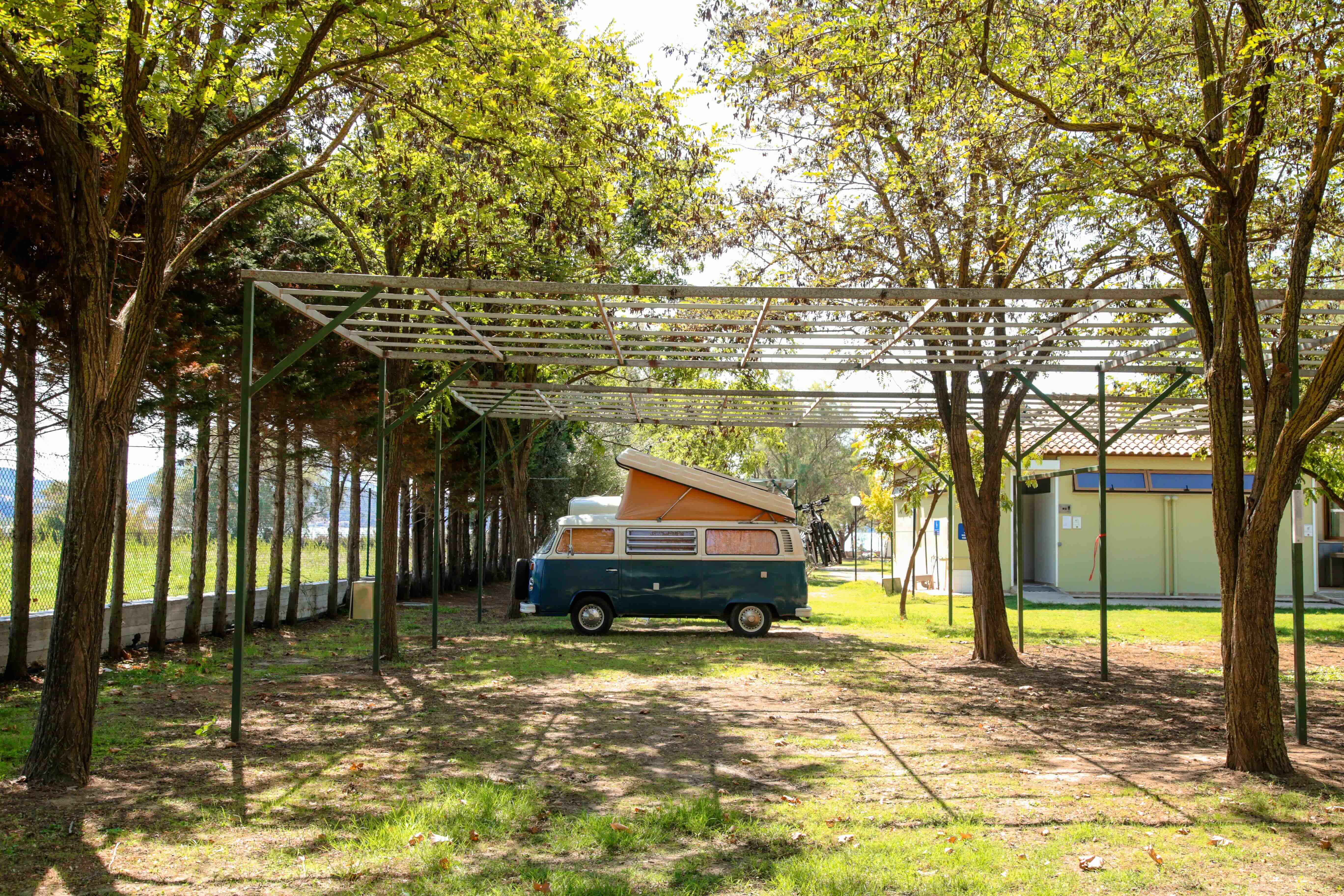 Emplacements dans la première zone, proches de la mer, avec ombre naturelle et artificielle et électricité. Recommandé pour les petits camping-cars, campervans, petites caravanes et tentes.